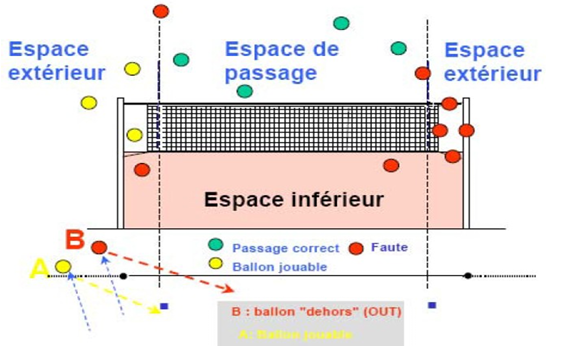 - Les ballons qui touchent la mire, le filet en dehors de la mire ou le poteau de son côté du terrain, ainsi que tout obstacle que le premier n’aurait pas vu